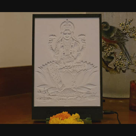 This divine lithograph of Goddess Lakshmi presents her seated on a radiant pink lotus, embodying wealth, fortune, and auspiciousness. With gold coins flowing from her hand and lotuses in the others, she blesses her devotees with prosperity, beauty, and spiritual well-being. Adorned in vibrant attire and surrounded by sacred offerings and lamps, the image exudes divine energy and graceful abundance.