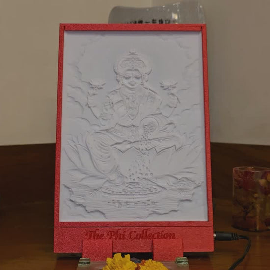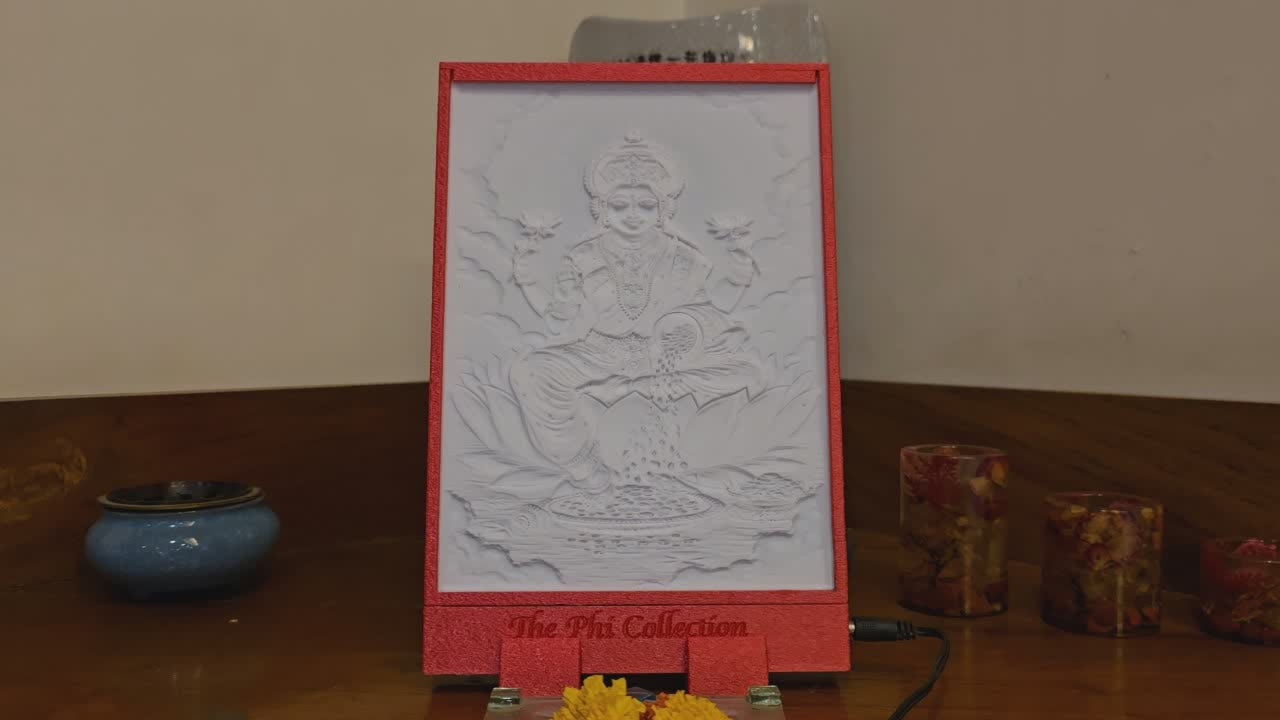 This radiant lithophane of Goddess Lakshmi shows her seated on a blooming lotus, symbolizing purity, prosperity, and divine grace.