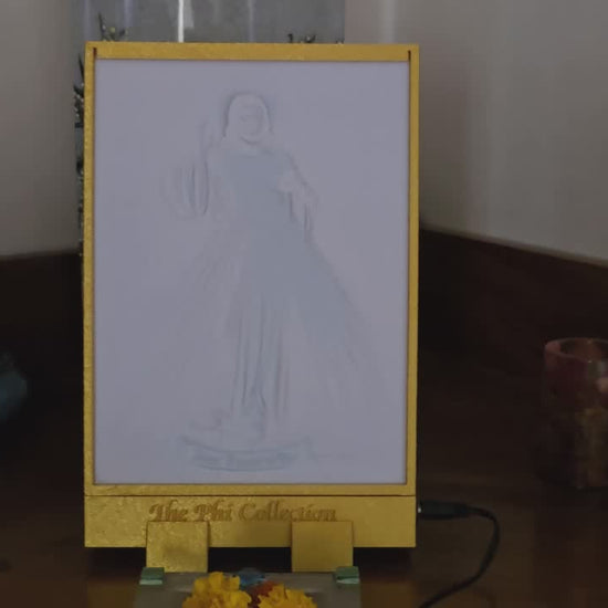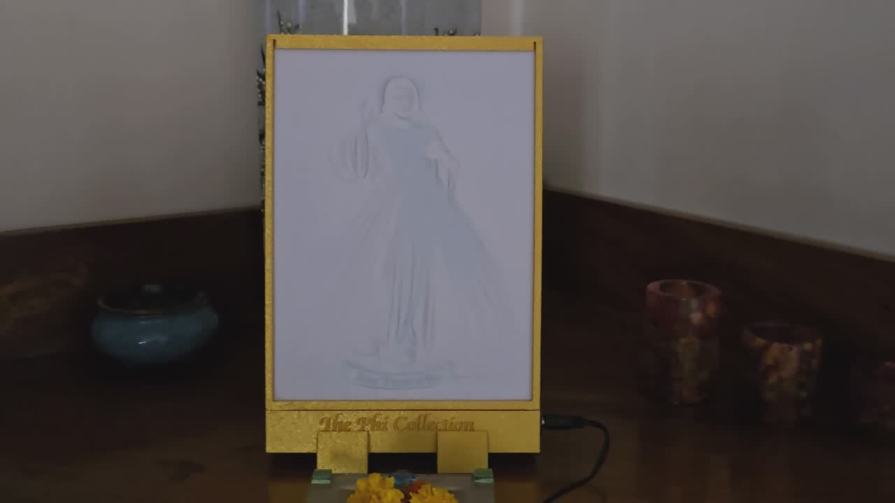 This Lithophane of Divine Mercy shows Jesus radiating red and white rays from His heart, symbolizing His blood and water — mercy and purification.
