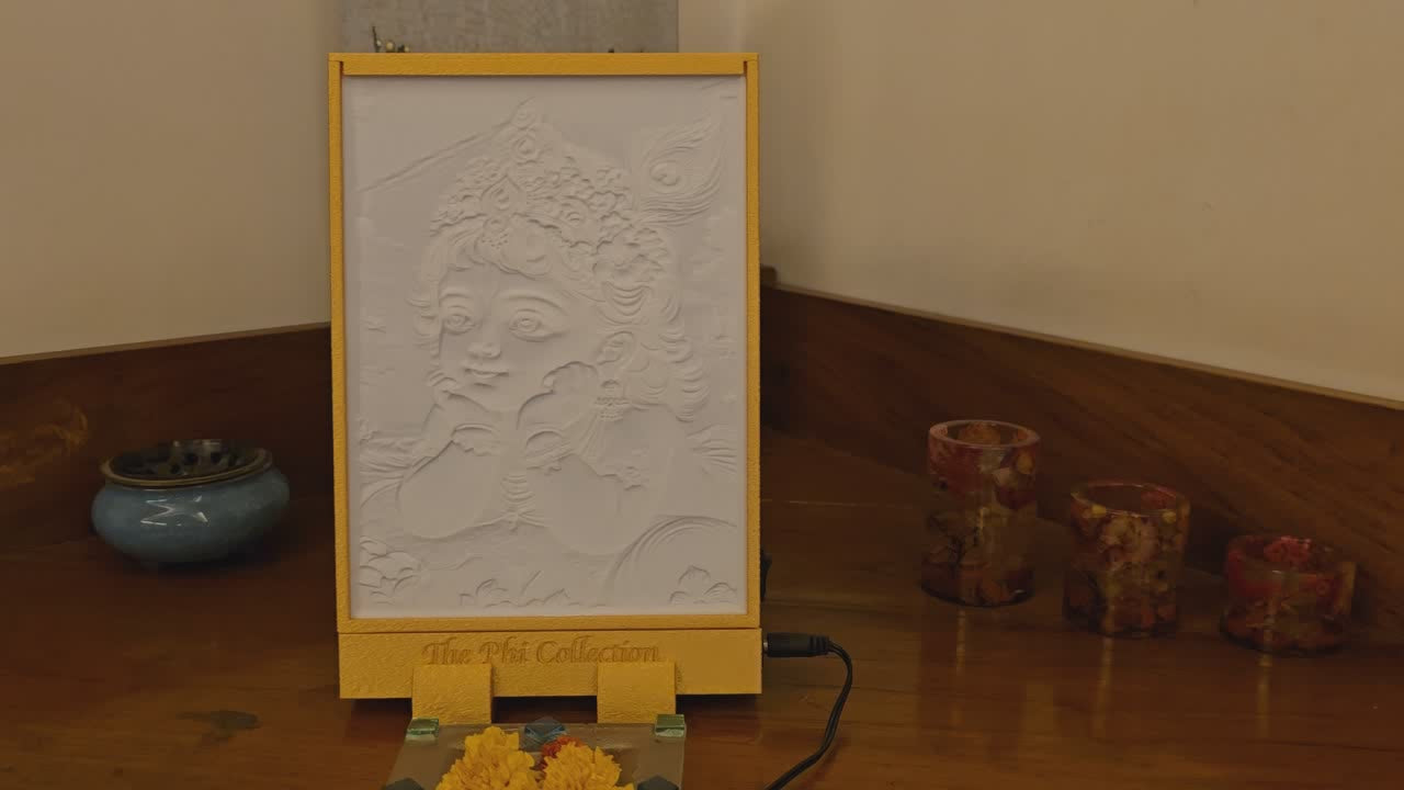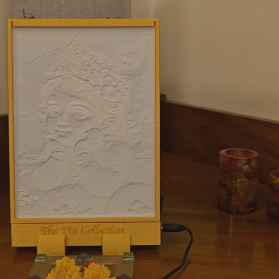 This lithographic image of Baby Krishna captures his divine innocence and playful charm as he gazes dreamily at the horizon. Adorned with a radiant crown, vibrant flowers, and peacock feathers, he reflects celestial beauty and joyful wonder. The golden sunset and serene backdrop enhance the spiritual warmth, symbolizing hope, love, and eternal bliss.