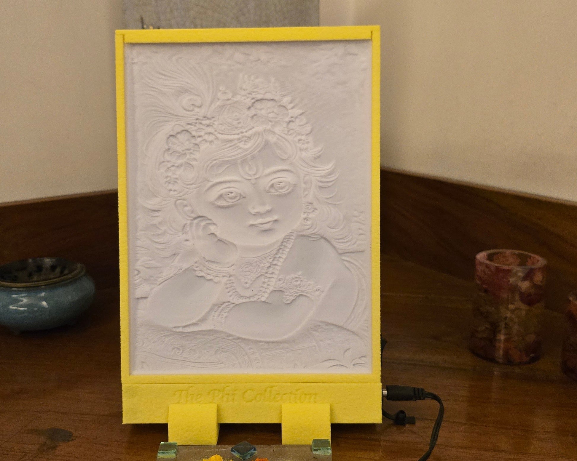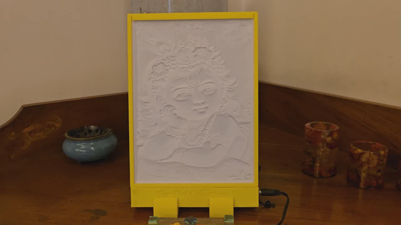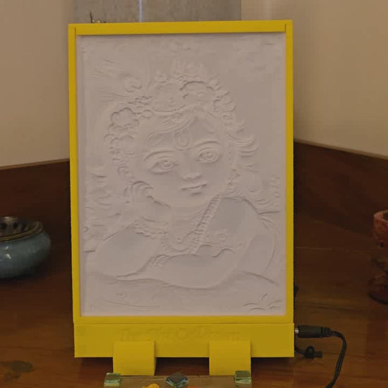 This lithophane of Baby Krishna exudes divine innocence, with his sparkling eyes and serene smile evoking pure joy. Adorned in a crown of flowers, pearls, and peacock feathers, he rests dreamily on a golden cushion, radiating celestial charm. The lush green backdrop and warm light highlight his playful divinity, symbolizing peace, beauty, and eternal love.