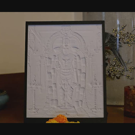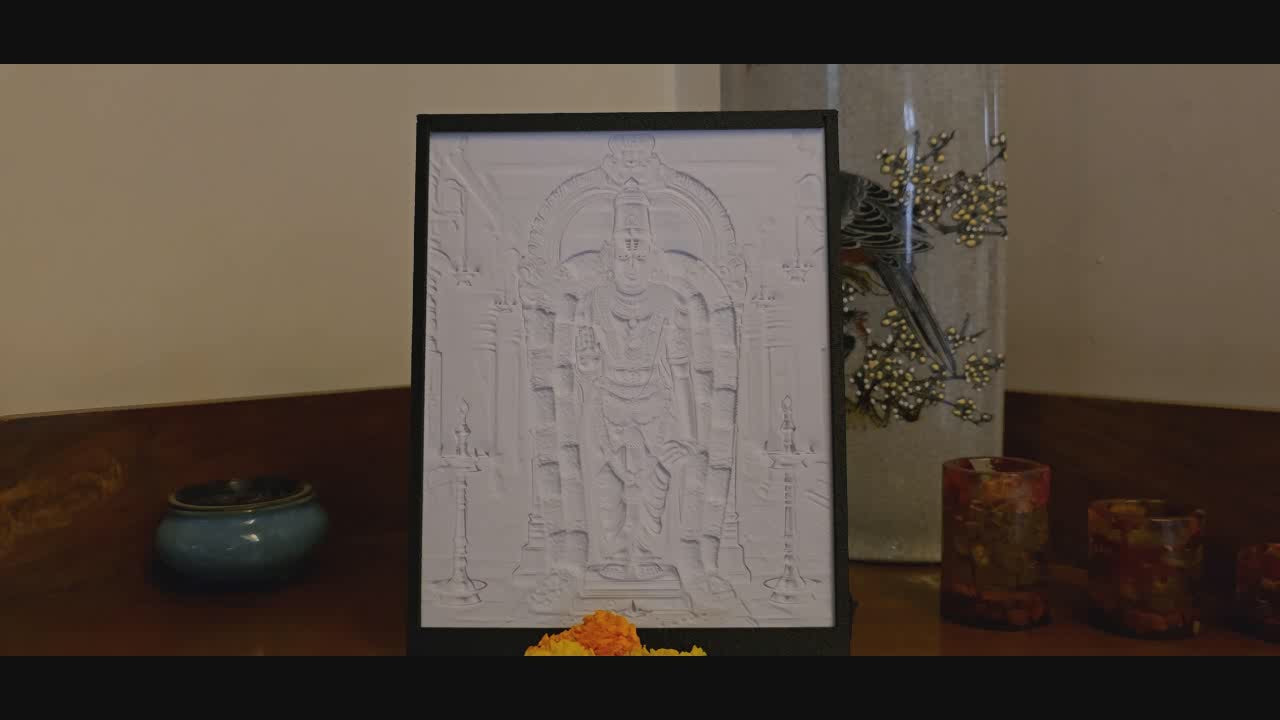 This lithograph of Lord Venkateshwara exudes sacred grandeur, with the deity standing gracefully adorned in vibrant silk robes and traditional jewellery. Framed by a majestic arch and garlanded with fresh flowers, he radiates divine blessings, serenity, and spiritual power. Surrounded by glowing oil lamps in an ancient temple setting, the image symbolizes devotion, divine presence, and eternal prosperity.