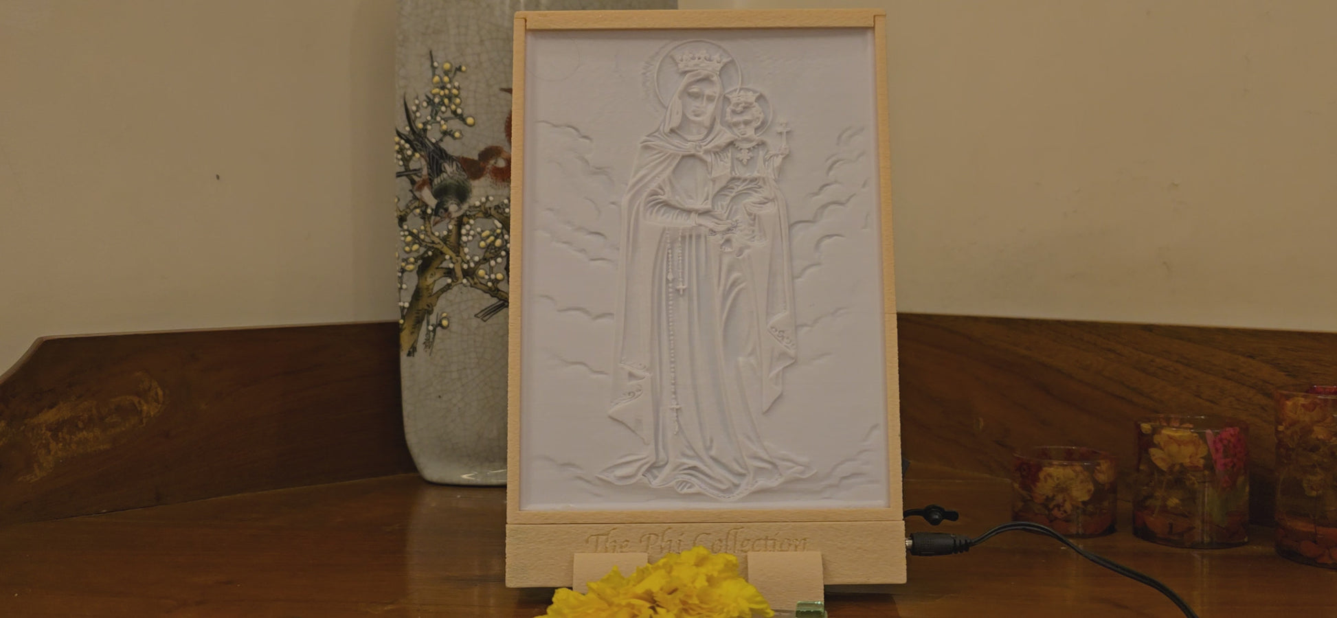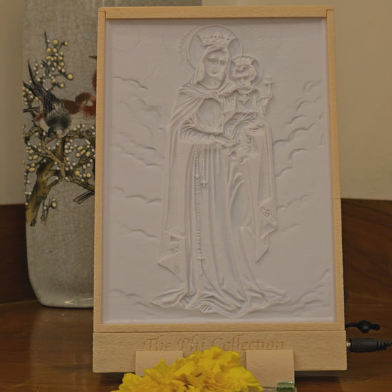 This lithograph depicts Mary Help of Christians, gracefully standing with the Child Jesus in her arms, both crowned as a symbol of their divine authority. The intricate details of Mary’s flowing robes, the rosary at her side, and the heavenly clouds surrounding them highlight the sanctity of the image. The Child Jesus, holding a small cross, radiates innocence and blessing. Illuminated within its handcrafted frame, this piece exudes a sense of reverence, hope, and protection, making it a sacred centerpiece for prayer and devotion.