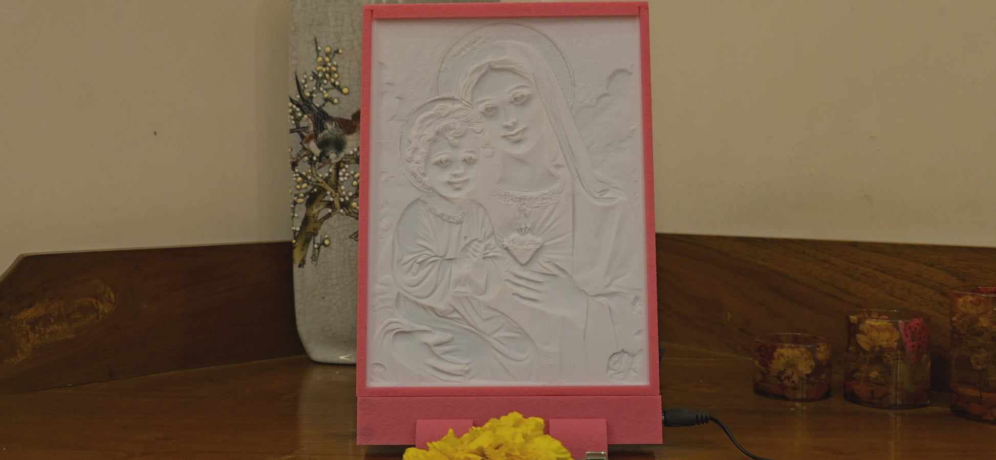 This lithograph beautifully portrays Mother Mary with the Child Jesus, radiating warmth and divine love. The Immaculate Heart of Mary glows with light, symbolizing purity, compassion, and her unwavering devotion. Baby Jesus, seated tenderly on her lap, gazes outward with innocence, offering a sense of peace and blessing. Enclosed in a graceful frame, this sacred image becomes a beacon of comfort, prayer, and spiritual strength for any home.