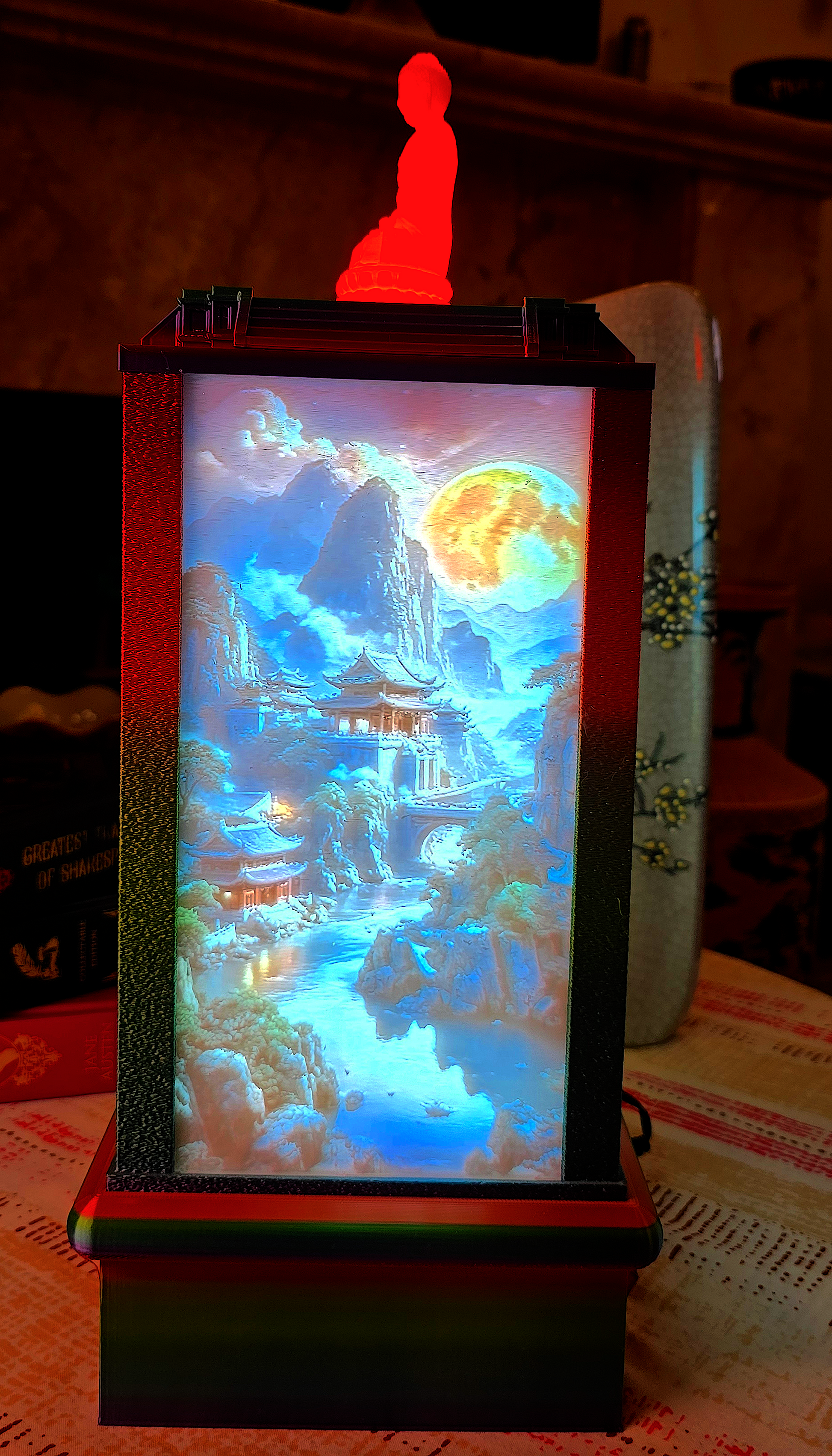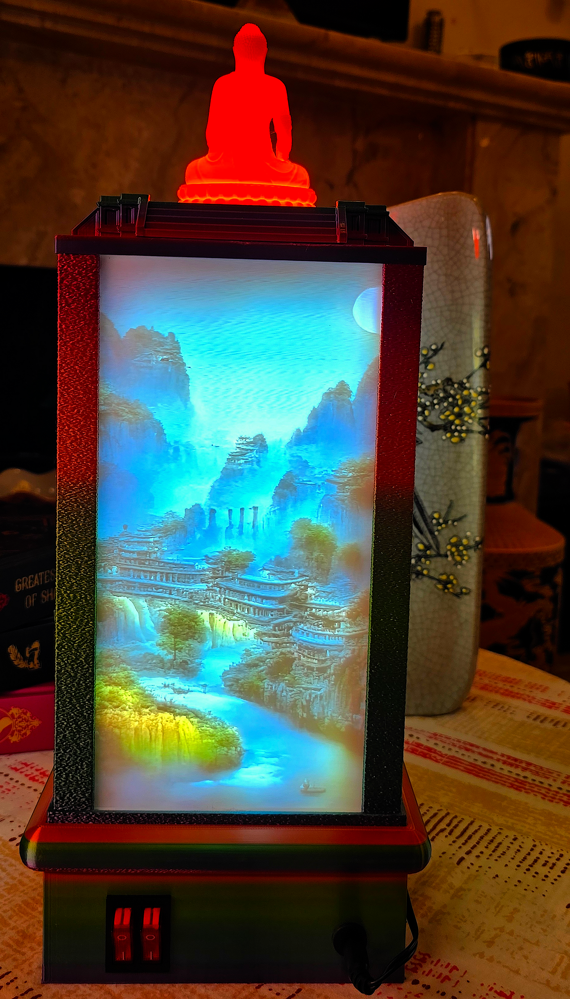 This Limited Edition four-sided Lithographic 3D Lamp captures the enchanting beauty of the Oriental Misty Blue Mountains, where flowing rivers wind through serene valleys and scenic landscapes come alive in soft, glowing detail. Each panel reveals a different vista—mist-shrouded peaks, tranquil waters, and lush horizons—blending together to create an immersive panorama of natural splendour. When illuminated, the lamp transforms into a radiant piece of art, evoking peace, calm, and the timeless charm of nature’s grandeur.