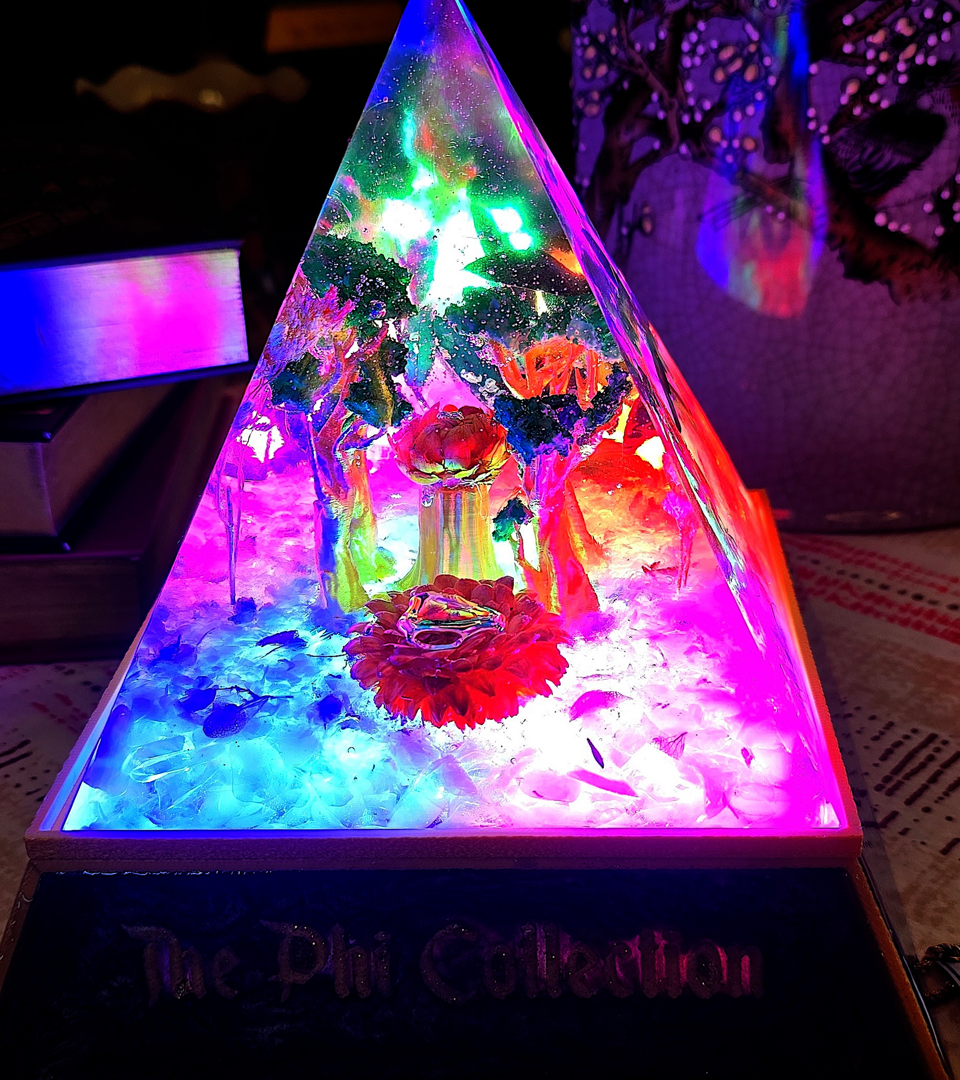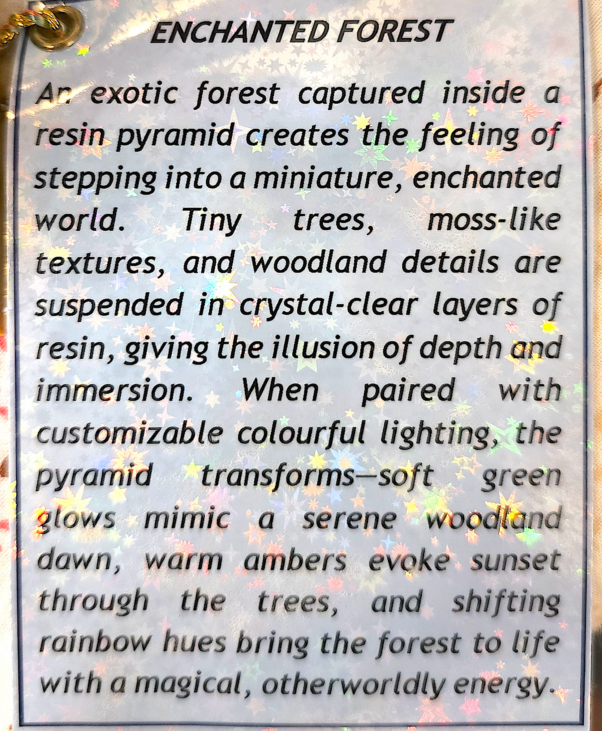 A forest theme captured inside a resin pyramid creates the feeling of stepping into a miniature, enchanted world. Tiny trees, moss-like textures, and woodland details are suspended in crystal-clear layers of resin, giving the illusion of depth and immersion. When paired with customizable colourful lighting, the pyramid transforms—soft green glows mimic a serene woodland dawn, warm ambers evoke sunset through the trees, and shifting rainbow hues bring the forest to life with a magical, otherworldly energy.