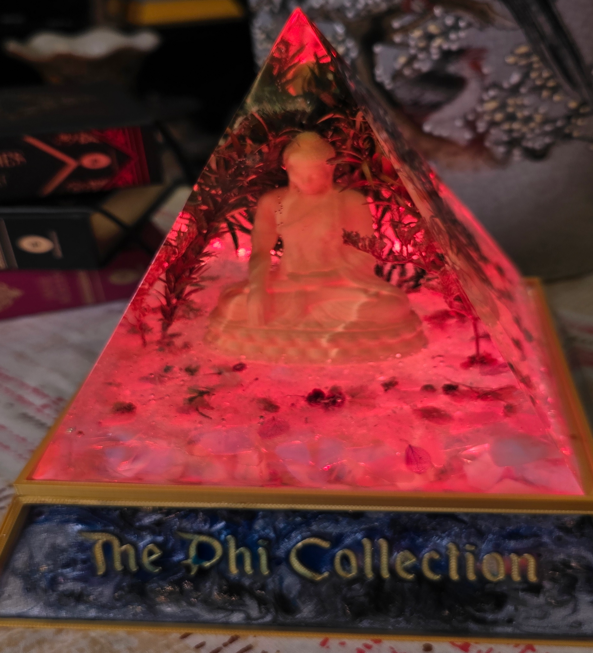 A golden Buddha rests serenely within a resin pyramid, surrounded by lush plants that create a backdrop of harmony and tranquillity. The figure seems immersed in its environment, as if nature itself embraces the divine presence. Enhanced by a choice of colourful lighting, the pyramid transforms into a radiant sanctuary—shifting from warm golden hues to colourful green and purple hues—each glow casting a new spiritual aura on the Buddha and its living surroundings.