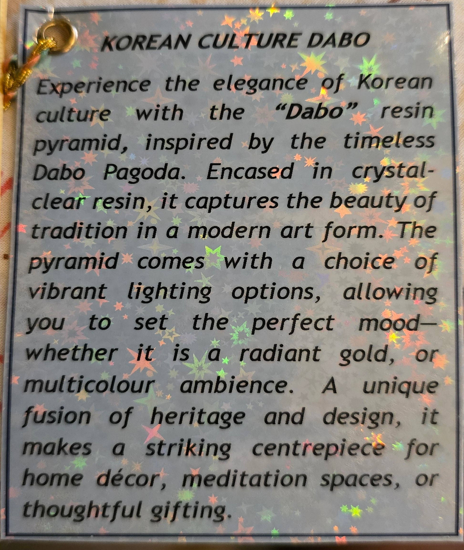 Experience the elegance of Korean culture with the “Dabo” Resin Pyramid, inspired by the timeless Dabo Pagoda. Encased in crystal-clear resin, this handcrafted piece captures the beauty of tradition in a modern art form. The pyramid comes with a choice of vibrant lighting options, allowing you to set the perfect mood—whether calming blues, radiant golds, or multicolour ambiance. A unique fusion of heritage and design, it makes a striking centrepiece for home décor, meditation spaces, or thoughtful gifting.
