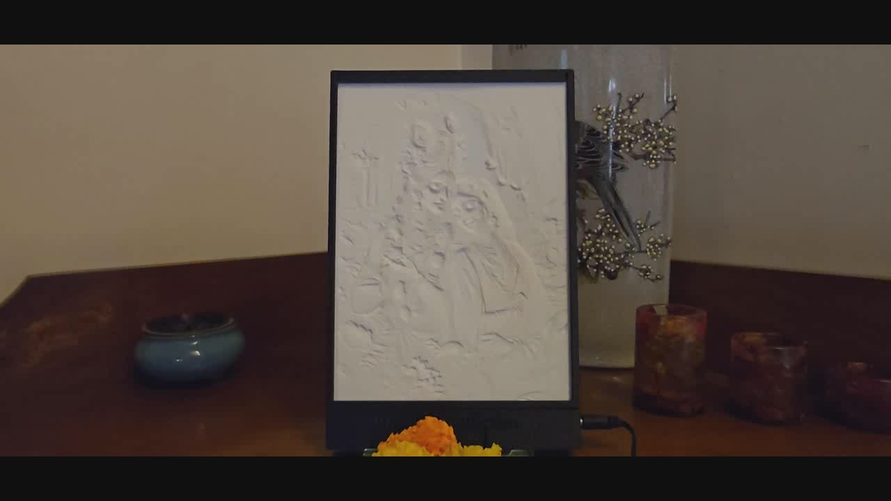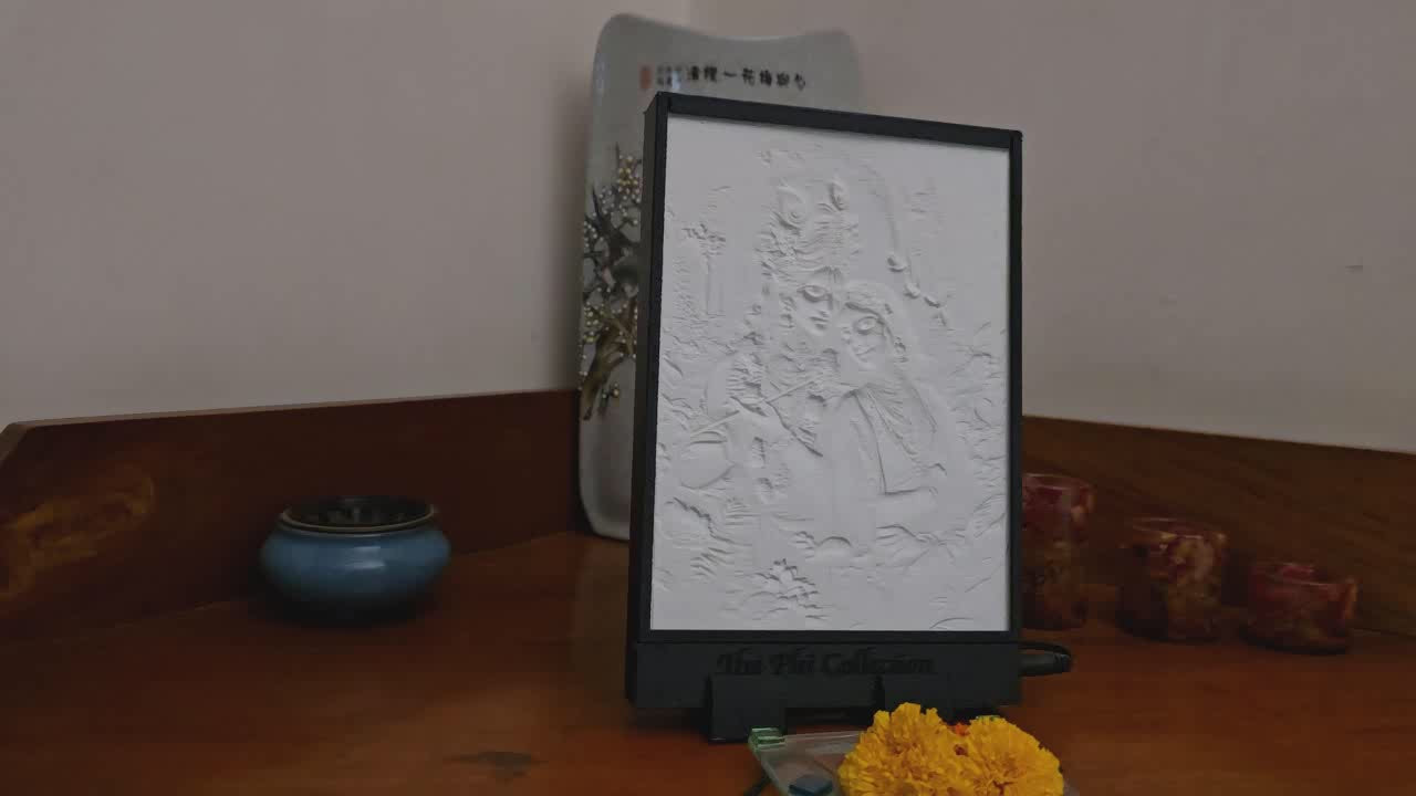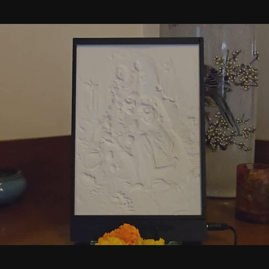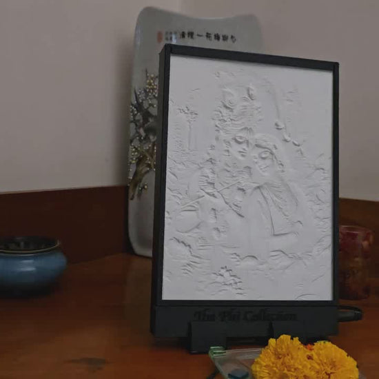This lithophane of Radha and Krishna captures the divine essence of love, devotion, and eternal union amidst a mystical forest. With Krishna playing his flute and Radha leaning gently on him, their serene expressions radiate peace and spiritual bliss. Surrounded by blooming flowers and soft, ethereal light, the image symbolizes the transcendental beauty of divine love.